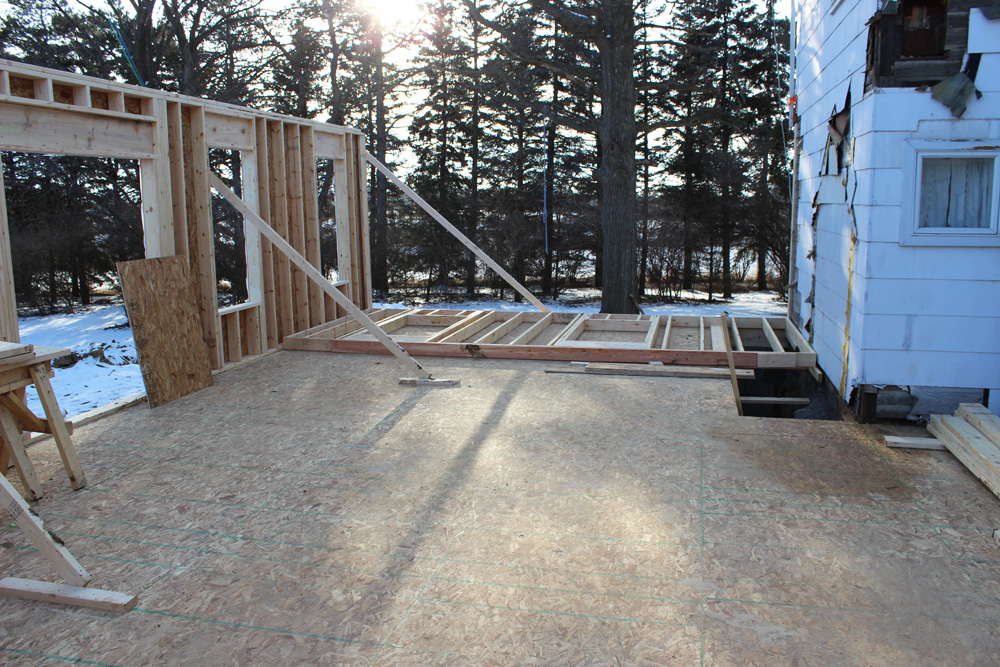 The walls were started after the sub floor was finished today. The crew took care to probe into the existing structure's second story to ensure the second floor would line up. Of course, in a house over 150 years old the framing was not level. This discrepancy will be addressed later through other means.
